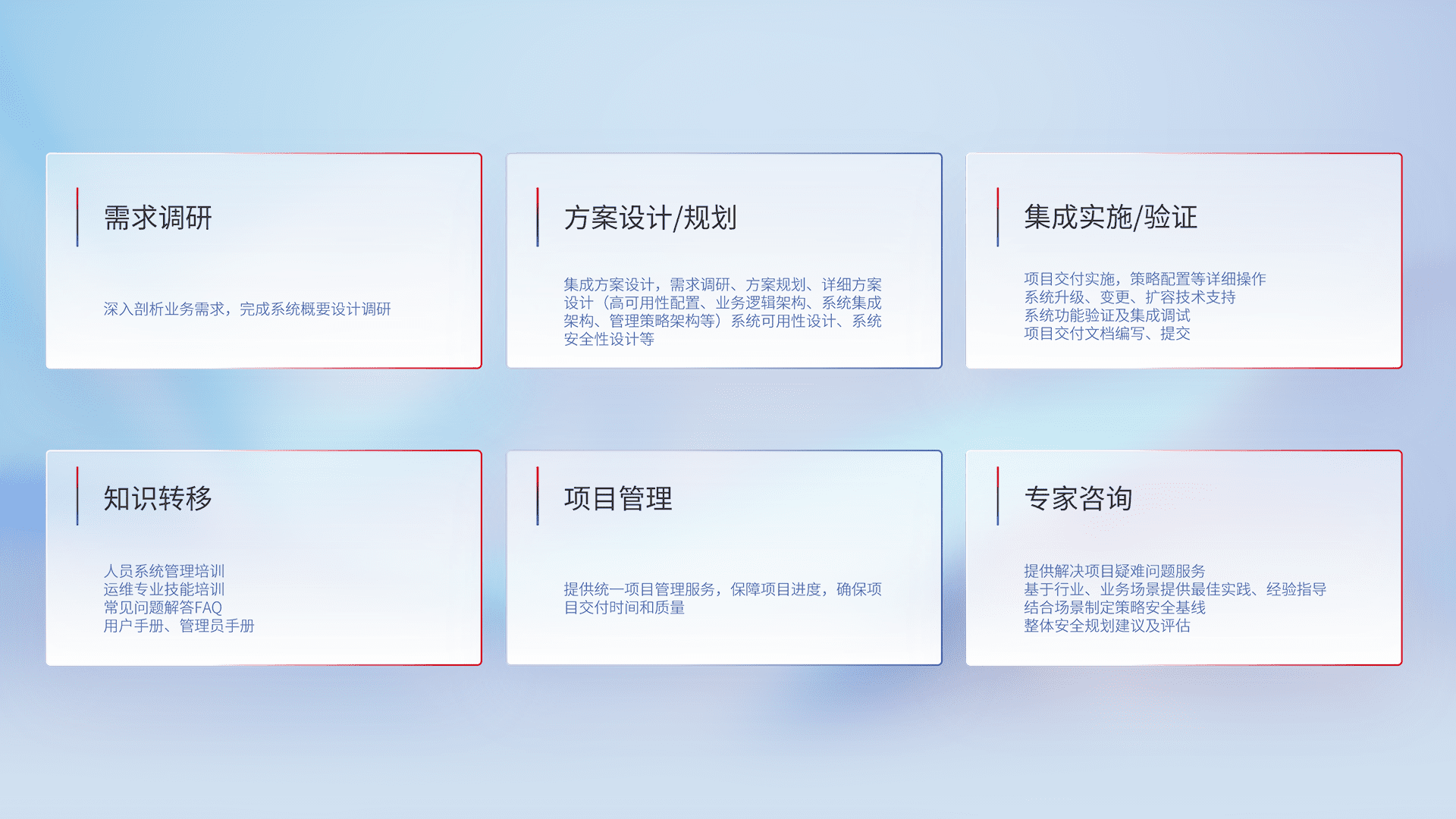 针对客户行业特性,,,将宏观的安全战略和需求,,,通过专业的交付服务,,实现项目落地,,,,为客户提供标准规范的集成交付服务。。